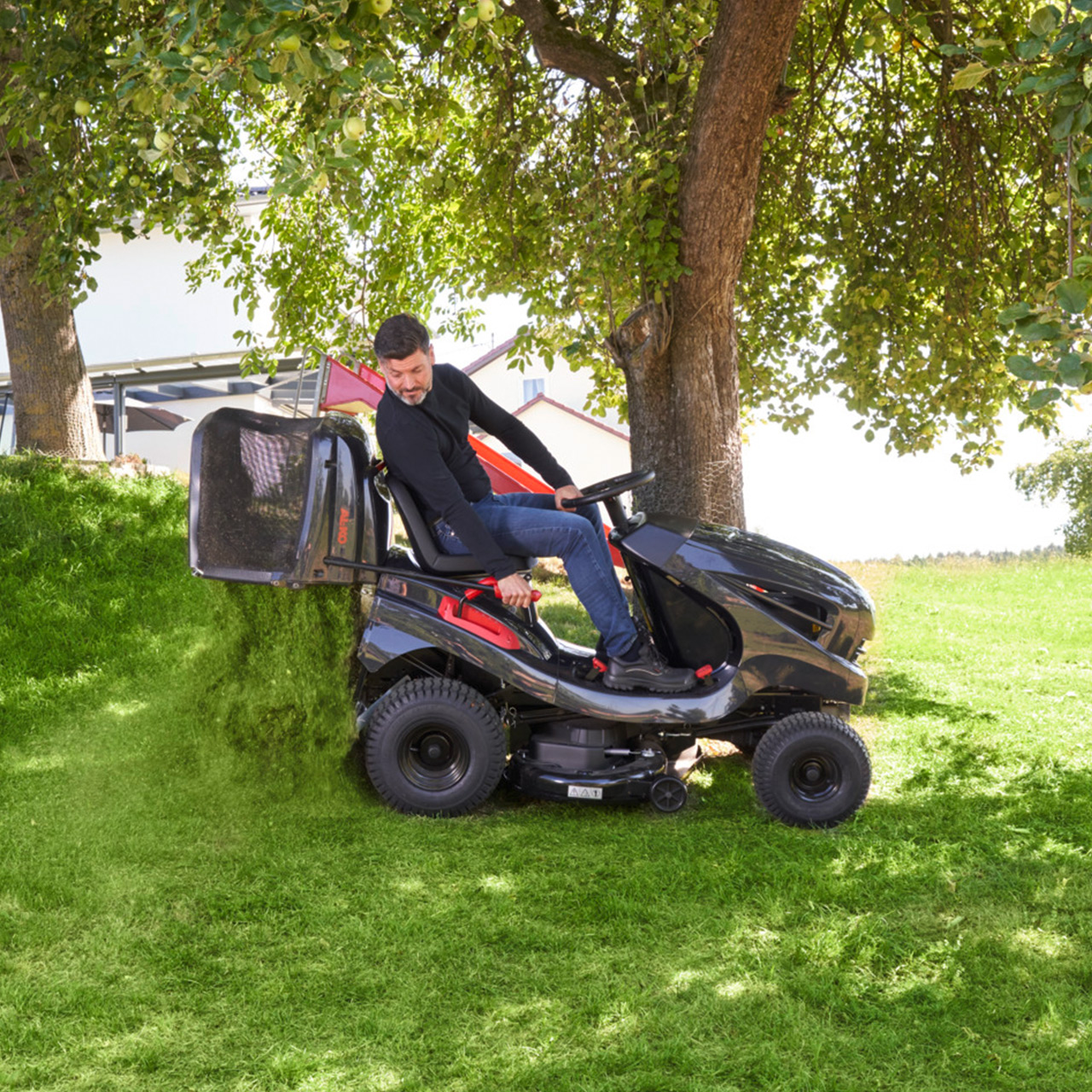 Möchten Sie die optionale Mulchfunktion (Mulchkeil Art.Nr. 119656) dieses Traktors nutzen kann dieser werkzeuglos umgerüstet werden. Durch den stufenlosen Fußhydrostat können Sie mit den ergonomisch angeordneten Pedalen und der optimalen Sitzposition ganz entspannt mähen. Die große Fangbox mit 220 L Inhalt kann per Teleskophebel bequem vom Sitz aus entleert werden.