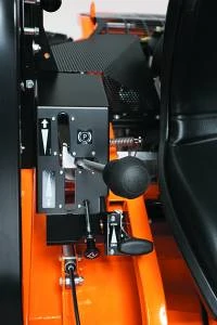 Durch den Hydrostatantrieb lässt sich der Aufsitzschlegelmäher komfortabel und stufenlos im Bereich von 6,8 km/h vorwärts und 6,3 km/h rückwärts steuern. Der permanente Allradantrieb sorgt für besten Vortrieb in jedem Gelände. Das Hinterachsdifferential kann jederzeit per Fußpedal gesperrt werden. Das Fahren erfolgt einfach und komfortabel über den Hand-Fahrhebel. Im Fahrhebel sind auch die automatische Parkbremse und die Tempomat-Funktion integriert. Zur Sicherheit verfügt die Maschine zudem, wie einem PKW, über ein Not-Bremspedal für den rechten Fuß.