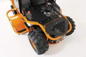 Die ergonomische und aufrechte Sitzposition in der Maschine gewährleistet große Beinfreiheit für Bediener bis zu 1,95 m Körpergröße. Der Schalensitz lässt sich an jeden Benutzer in der Länge einstellen. Auch das innovative Federungssystem mit Endlagendämpfung ist individuell und stufenlos an jeden Fahrer anpassbar. Zudem sind alle Bedienelemente logisch angeordnet und komfortabel erreichbar. Seitenverkleidungen aus Aluminium schützen die Hände des Fahrers vor Dornen und Gestrüpp. Ein serienmäßiger Reifenpannenschutz mit AS-Motor Plattfuss-Stop verhindert zuverlässig Plattfüße.