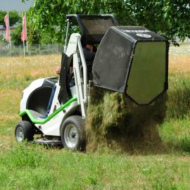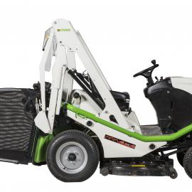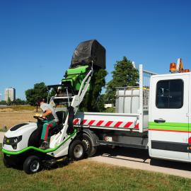 Der neue Aufsitzmäher Buffalo 124 ist mit einem integrierten 600-Liter-Grasfangkorb mit hydraulischer Leerung ausgestattet, die vom Fahrersitz gesteuert wird.