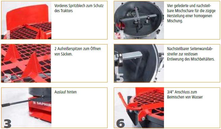 Der SAPHIR Betonmischer verfügt über eine Dreipunktaufnahme Kat. II, sowie Einfahrtaschen für Gabelzinken