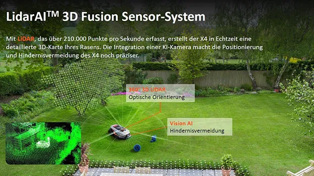 ![]() | LidarAI™ 3D Fusion Sensor-System Der Sunseeker Elite X4 erstellt mit seinem LiDAR-System über 210.000 Punkte pro Sekunde eine detaillierte 3D-Karte Ihres Gartens. Die Kombination mit der KI-Kamera sorgt für präzise Positionierung und zuverlässige Hindernisvermeidung. |