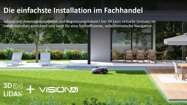 Einfache Installation ohne Kabel Keine umständliche Antennenmontage oder Begrenzungskabel mehr nötig. Der X4 richtet virtuelle Grenzen im Handumdrehen ein und ermöglicht eine effiziente, vollautomatische Navigation. | ![]() |