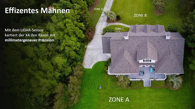 ![]() | Millimetergenaue Rasenpflege Dank des LiDAR-Sensors kartiert der X4 die Rasenfläche präzise und sorgt für ein gleichmäßiges Schnittbild bis in die kleinsten Winkel. |