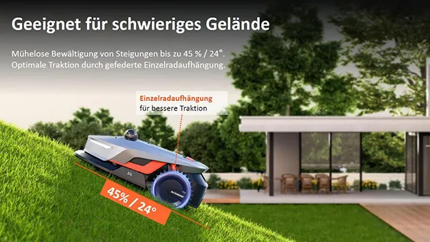 Perfekt für anspruchsvolles Gelände Der X4 meistert mühelos Steigungen bis zu 45 % / 24° und bietet durch die gefederte Einzelradaufhängung optimale Traktion auch auf unebenem Untergrund. . | ![]() |
