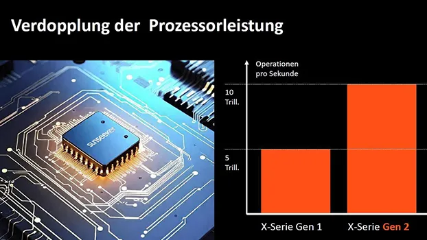 ![]() | Verdoppelte Rechenleistung Die neue Prozessorgeneration verarbeitet statt 5 nun 10 Trillionen Operationen pro Sekunde – für blitzschnelle Entscheidungen, präzisere Steuerung und noch effizienteres Mähverhalten. |