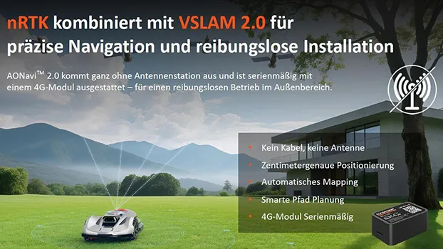 Präzisionsnavigation mit nRTK & VSLAM 2.0 AONavi™ 2.0 arbeitet vollständig kabellos, ohne Antennenstation und nutzt ein integriertes 4G-Modul für zuverlässigen Außeneinsatz. Das System ermöglicht zentimetergenaue Positionierung, automatisches Mapping und intelligente Pfadplanung. | ![]() |