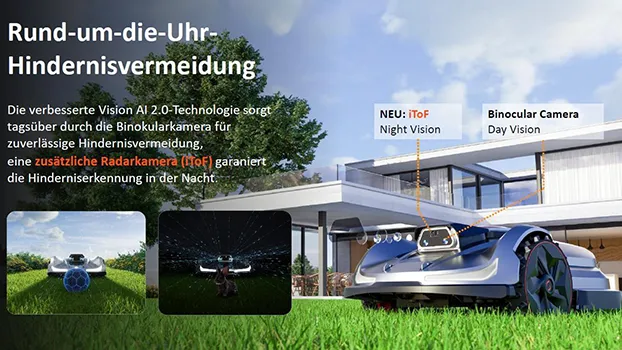 ![]() | 24/7-Hinderniserkennung Die optimierte Vision AI 2.0 nutzt eine hochauflösende Binokularkamera für präzise Hinderniserkennung am Tag, während die zusätzliche iToF-Radarkamera zuverlässige Objekterkennung bei Nacht sicherstellt. |