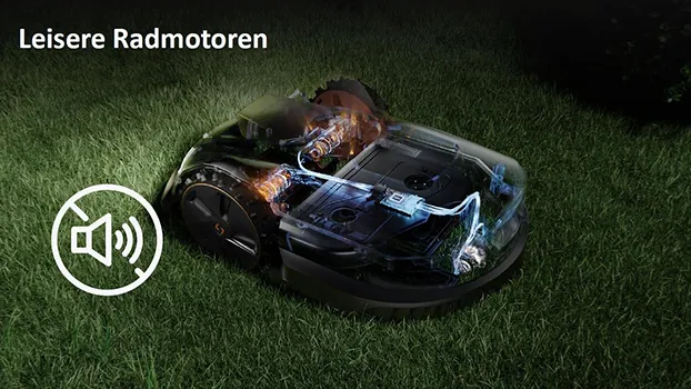 Leisere Radmotoren Die überarbeiteten Antriebsmotoren reduzieren Geräusche im Betrieb und sorgen für ein angenehmeres Mäherlebnis im Garten. | ![]() |